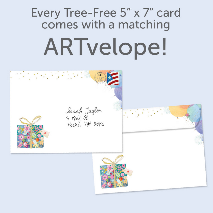 This Birthday card set shares the message "Hooray, it's your birthday!" on the cover, and on the inside reads "Let the confetti fly and the fun begin. Have the best birthday!". It features art by Lynn Horrabin and includes six 5 x 7 greeting cards with matching ARTvelopes (all our 5 x 7 envelopes are designed to match the greeting card cover art). Printing powered by solar energy. 100% Post-consumer recycled. Proudly Made in the USA